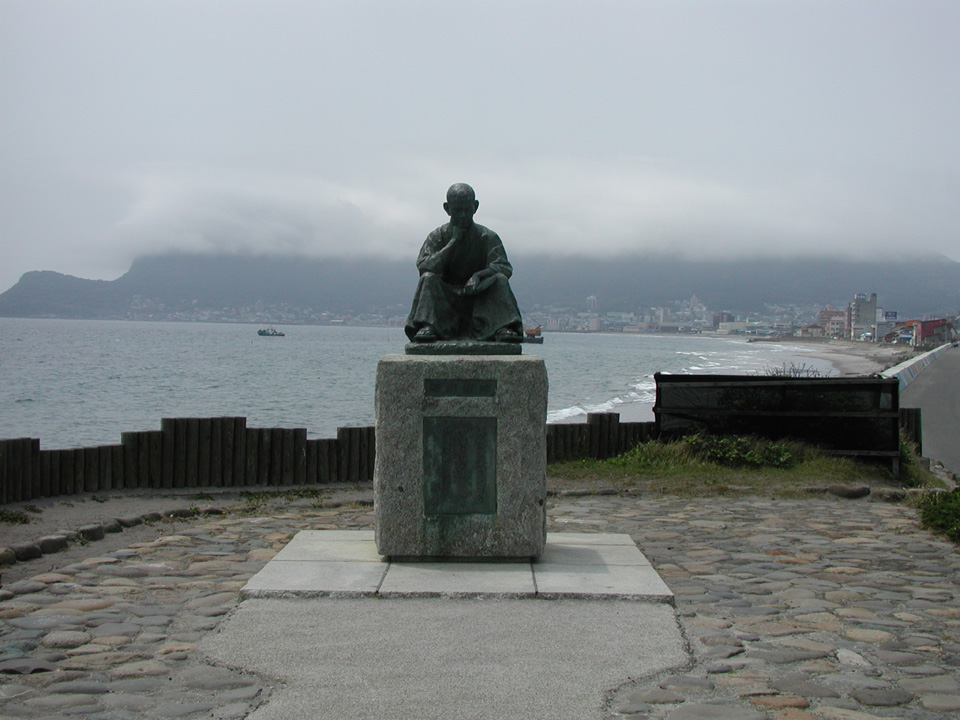 大森浜の脇、函館山をバックにたたずむ啄木像。この先、立待岬に向かう途中(山の左端あたり)には石川啄木一族の墓が有る。