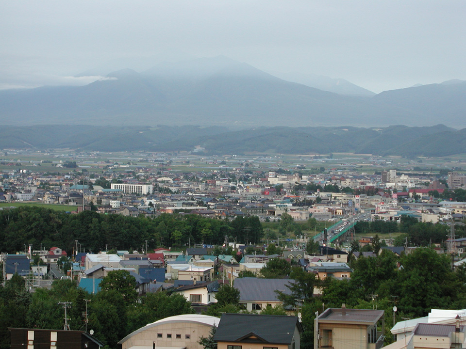 市街地側の客室からは十勝岳をバックに富良野の町をパノラミックに眺めることができる。夕方から夜にかけての明かりも綺麗。