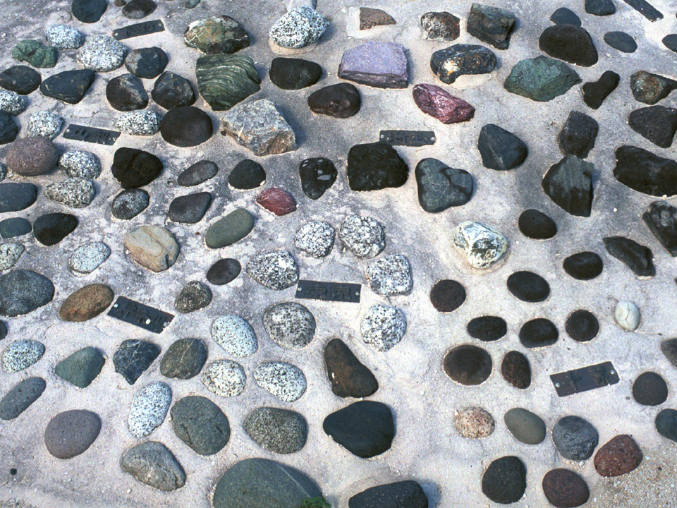 日本最南端 石の集められた都道府県名が銘板でわかります。液晶ディスプレイなら地名が読めると思いますが、ブラウン管ディスプレイではどうでしょうか?左側が神奈川、中央が東京、右側が千葉、上段左側が山梨、上段右側が埼玉です。