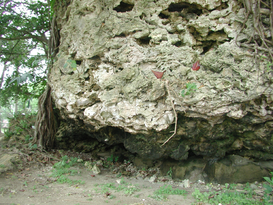 打ち上げられた津波石は、海岸にあった珊瑚礁のサンゴ石灰岩ですので、もともと海中にあった頃の化石が岩に付着しています。