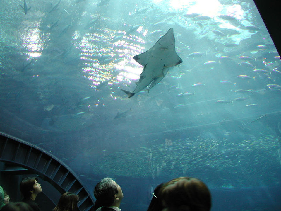 ここは大水槽を下から見上げることもできます。自分の頭の上を大きなジンベエザメやマンタが通りすぎて行きます。