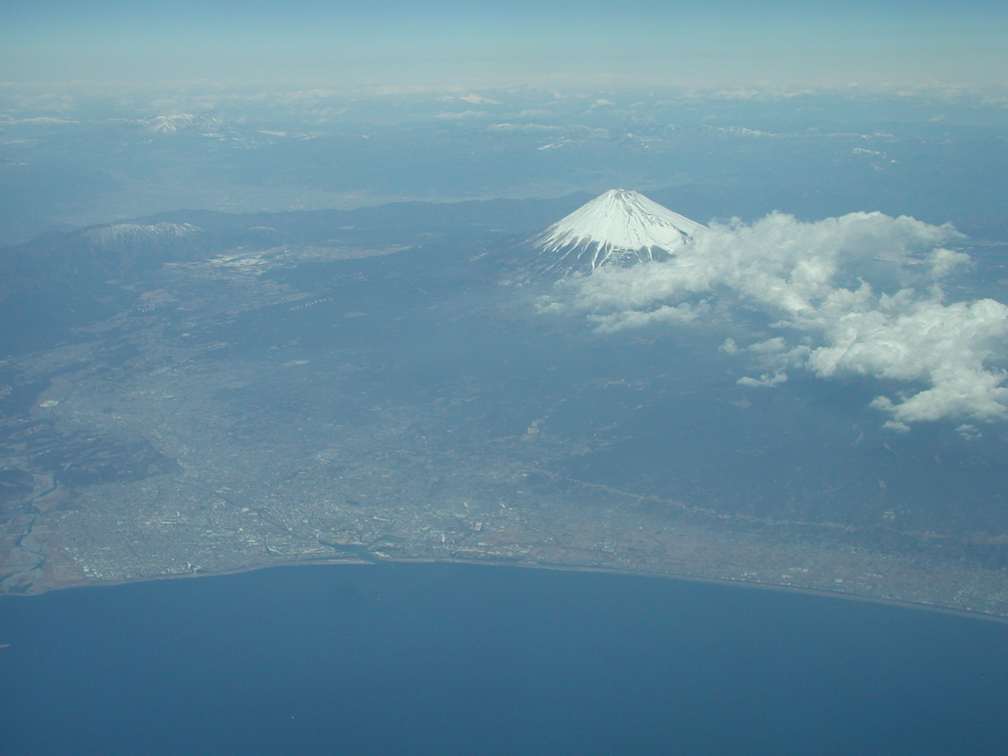 沖縄への空路 (4) のんたんのふるさと 駿河湾上空からすこし望遠を効かせてみました。左端が富士川、入り江のところが田子ノ浦です。東海道新幹線に乗っていてもこのあたりがいちばん富士山が美しいところです。富士市内の煙突の煙もいくつか見えます。富士市といえばのんたん。電波少年的放送局一番のチャーミングな女子アナウンサー、のんたんこと影山のぞみさんのふるさとです。