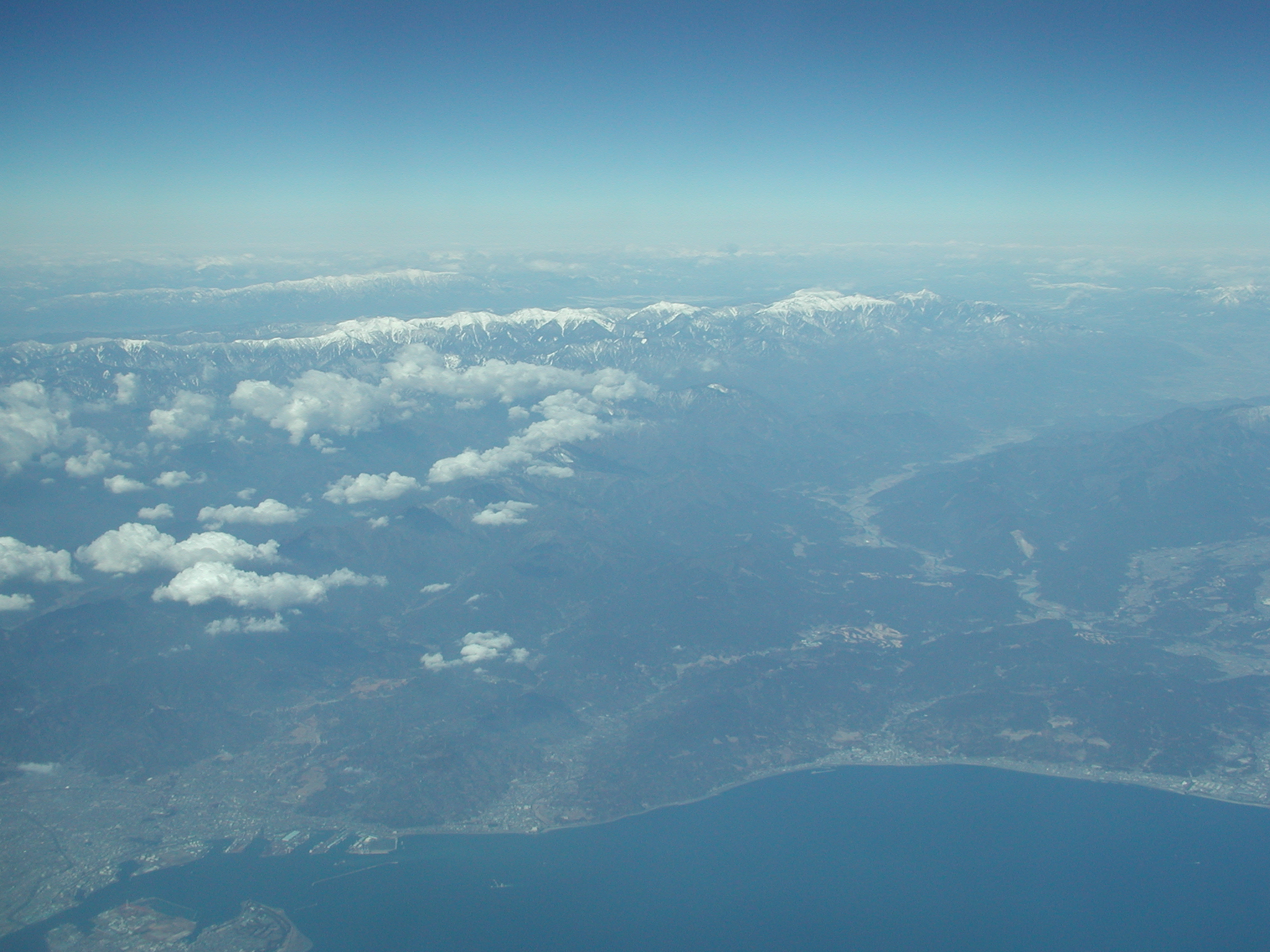 沖縄への空路 (5) 左下に羽衣の松で有名な三保と清水港が見えます。南アルプスをバックに間もなく焼津付近です。この後、進路を南南西(207度)に向け、ここから約70nm(Nautical Mile,1nm=1852m)、 およそ約130Kmほどで、伊豆大島から沖永良部島までの一直線コースにインターセプトします。
