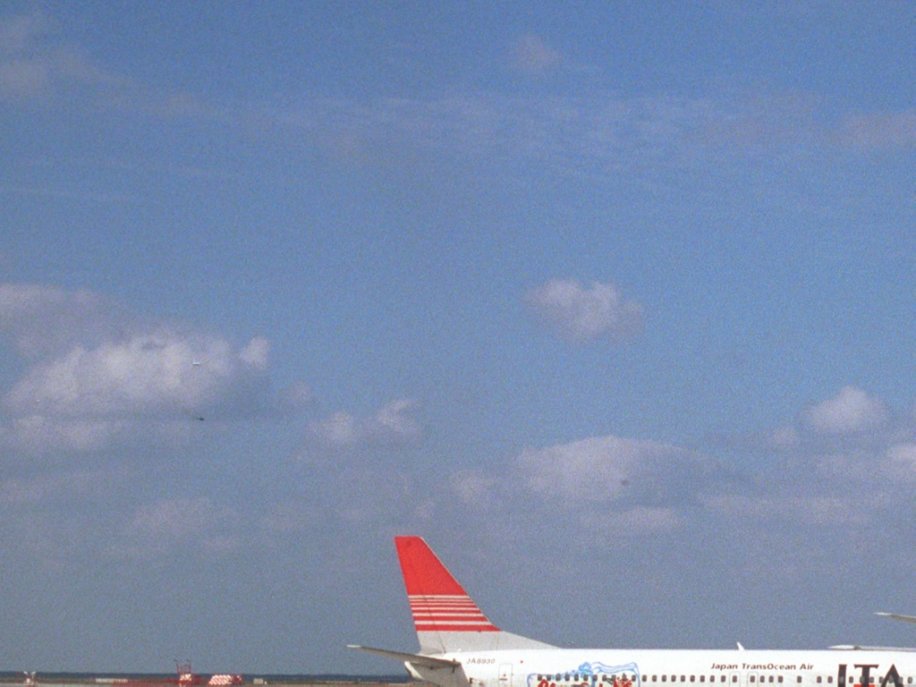 広くて青い空、ひとまわり小さなサイズの航空機といかにも沖縄らしい空港の風景である。