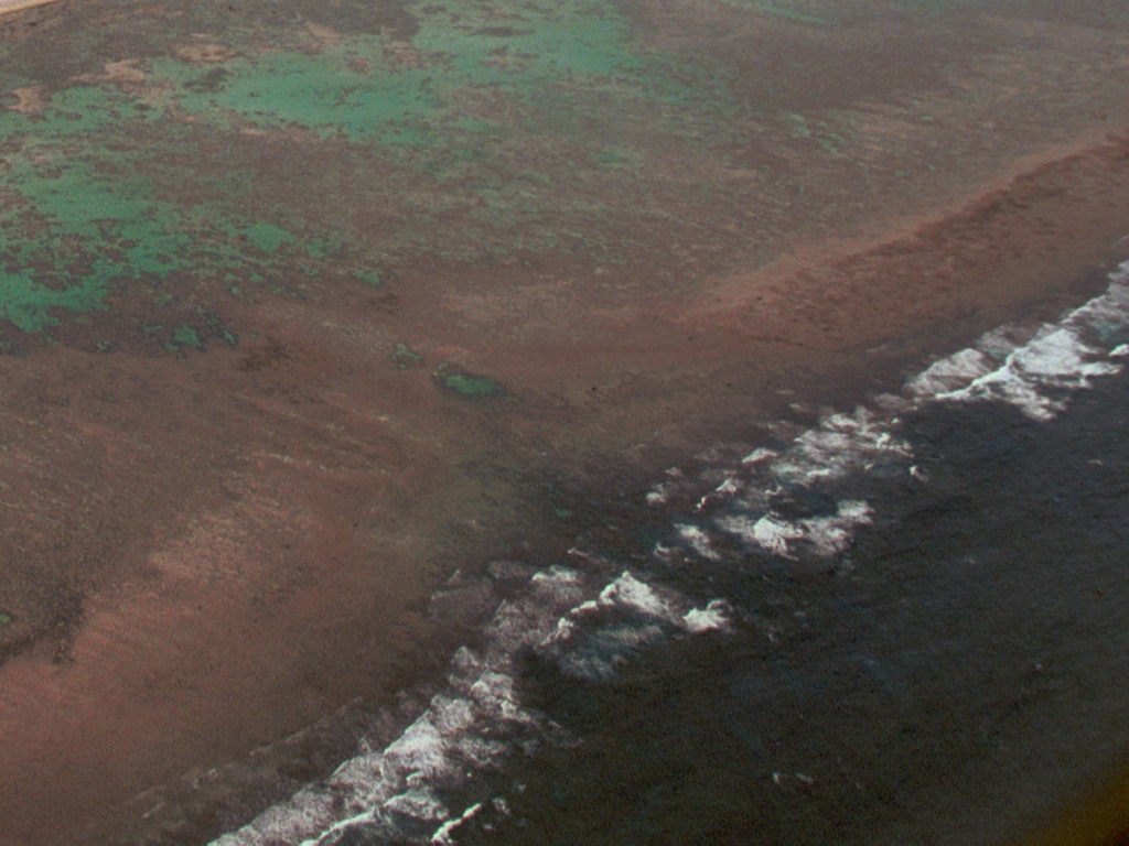 石垣島に近づき海岸線に沿って連なる世界的にも有名な白保地区の珊瑚礁が見えてきた。