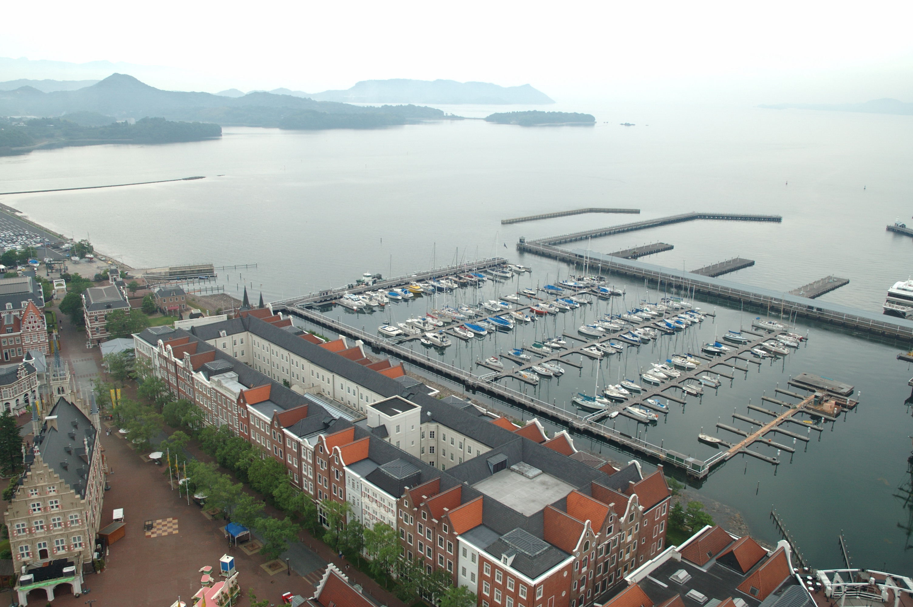 アレキサンダー広場の南側はホテルアムステルダムを挟みマリーナに面して大村湾が広がる。この正面はるか遠方に長崎空港がある。
