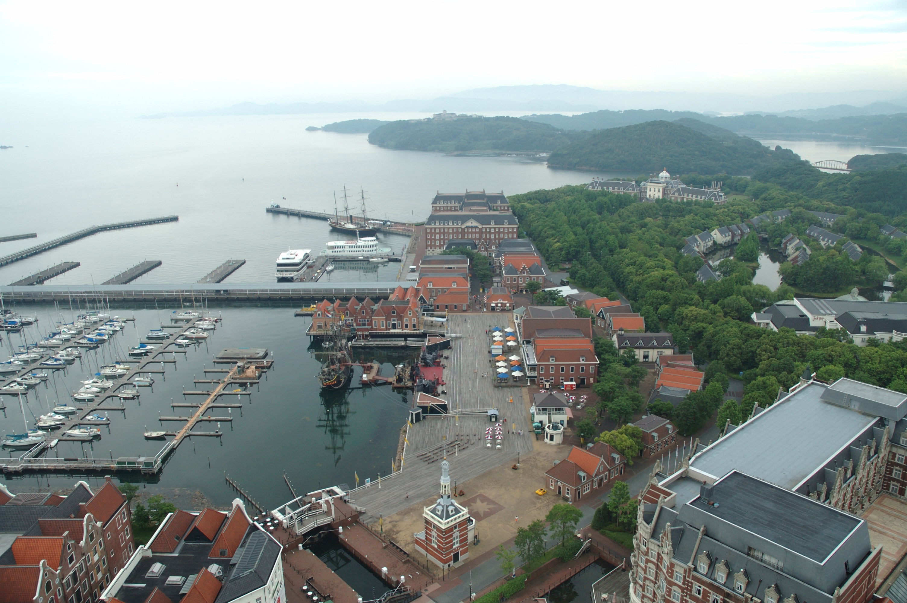 南側は海と夜のゾーン。オレンジ広場を中心にマリンターミナル、奥がホテルデンハーグ、更に奥の森のゾーンにパレスハウステンボス。